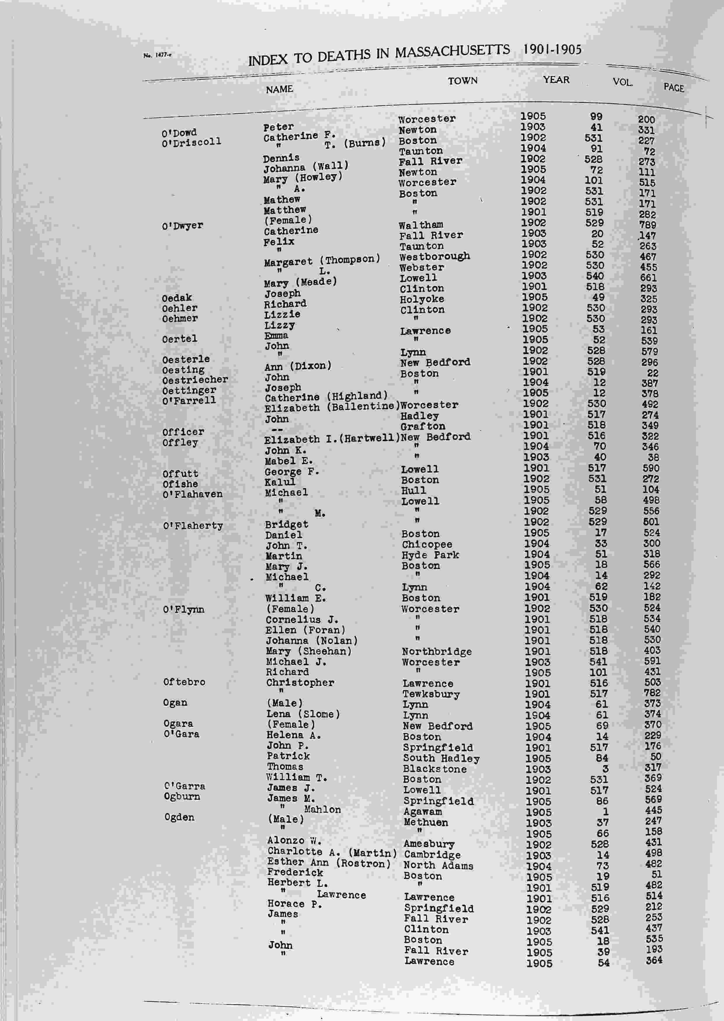 Index to Deaths in Massachusetts; Vol. 50, page lists George F. Offutt