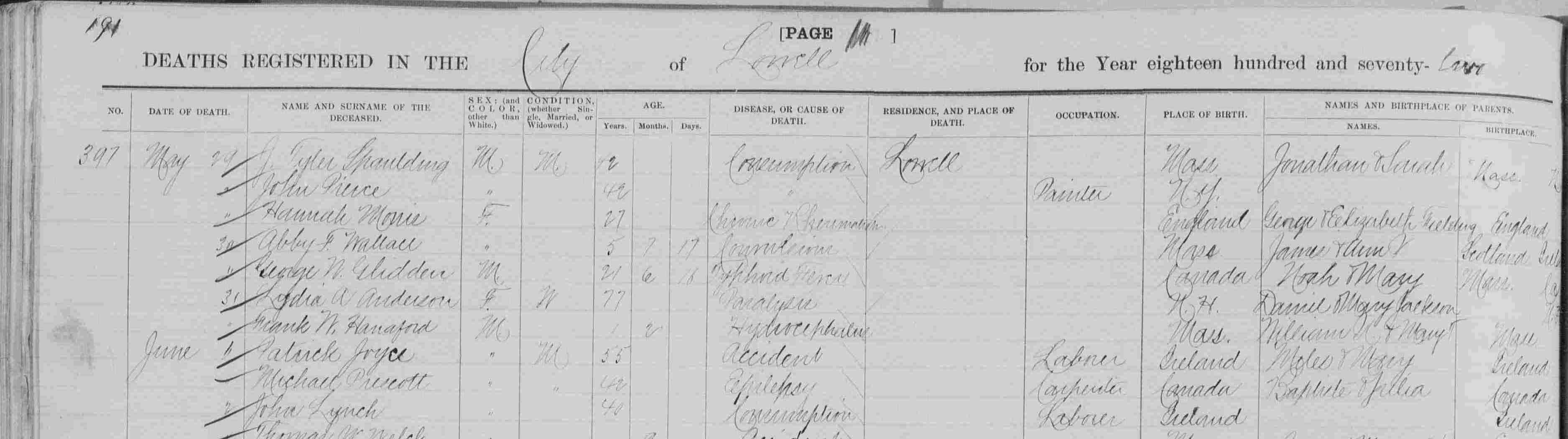 Lowell Massachusetts Death Register for 1872, death 398 lists John Pierce