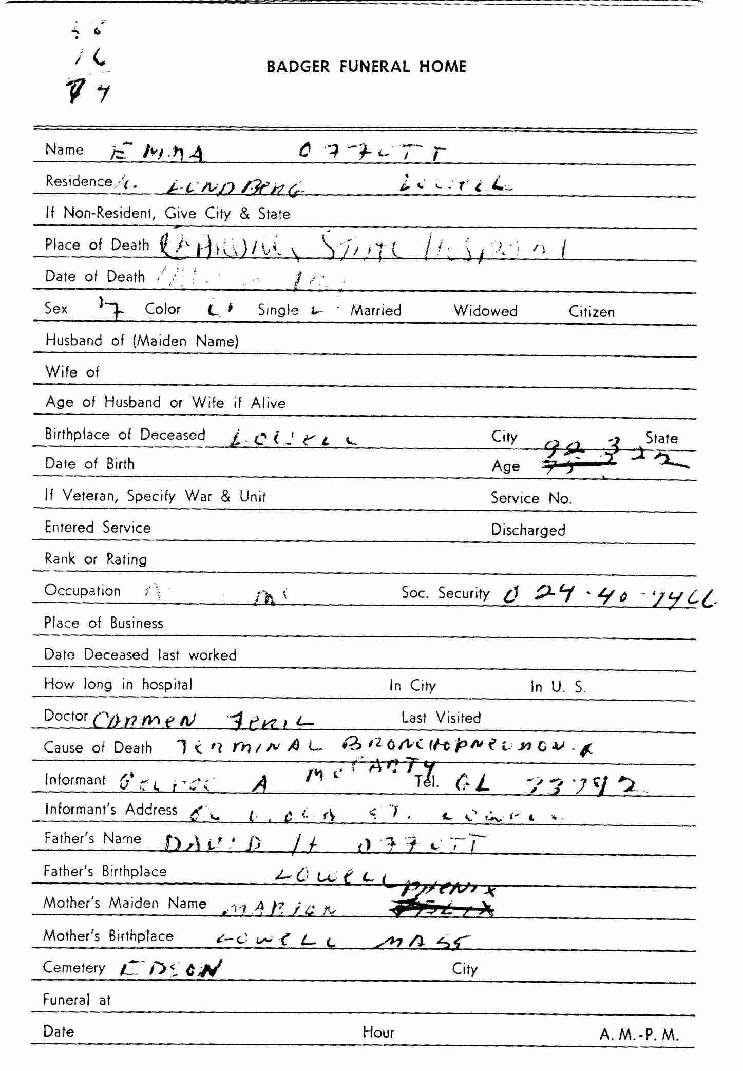 Funeral Home record for Emma Offutt