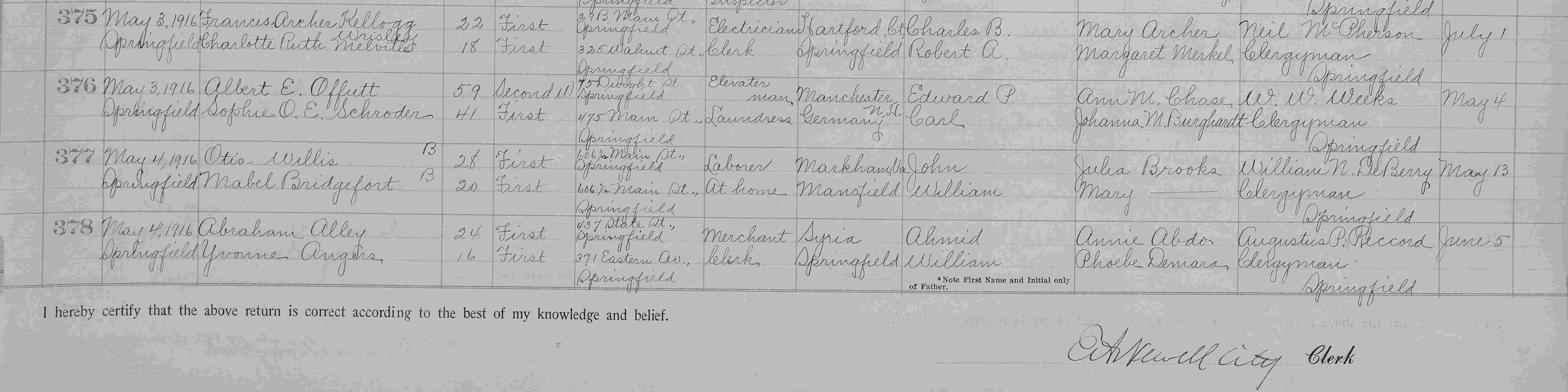 Springfield MA Marr. Reg. entry for Albert E. Offutt & Sophie O. E. Schroder