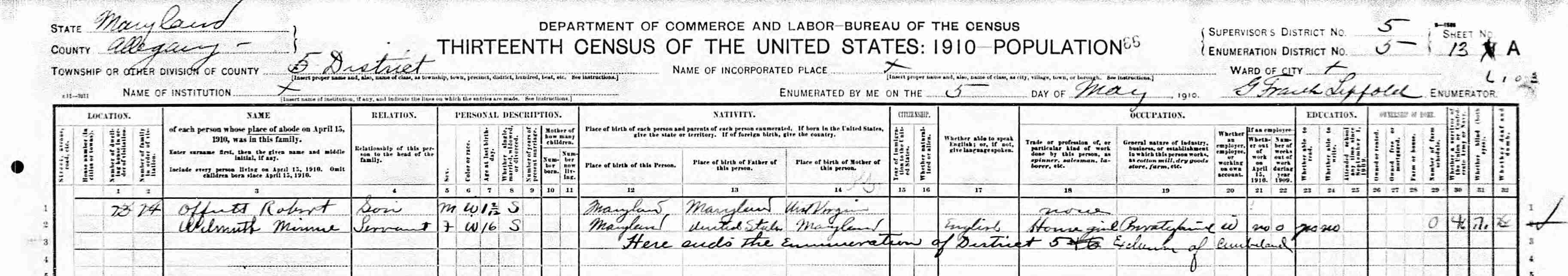 1910 Federal Census; Cumberland, Allegany County, MD. Household of James W. Offutt