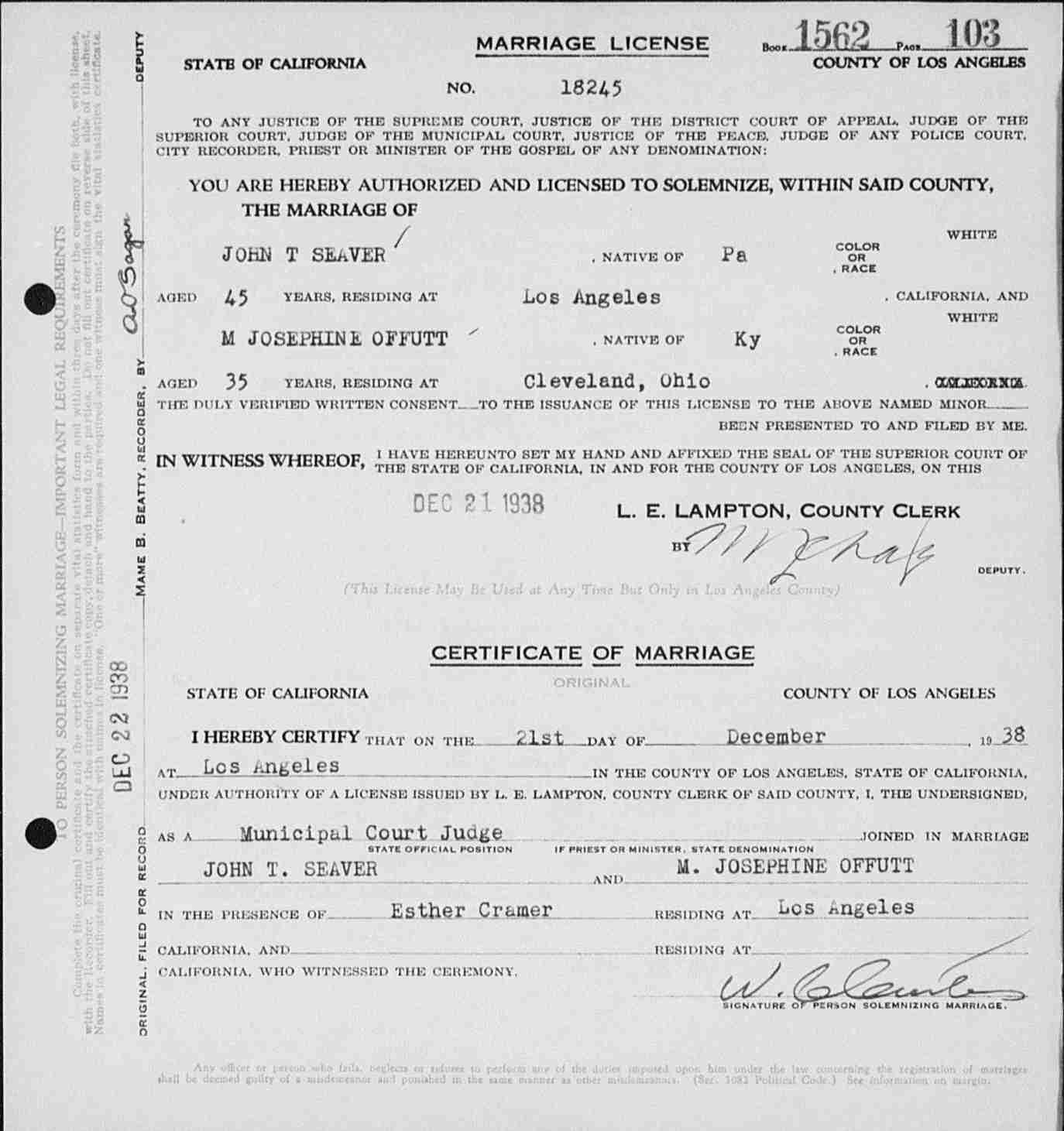 Marriage License and Return for Mary Josephine Offutt to John T. Seaver