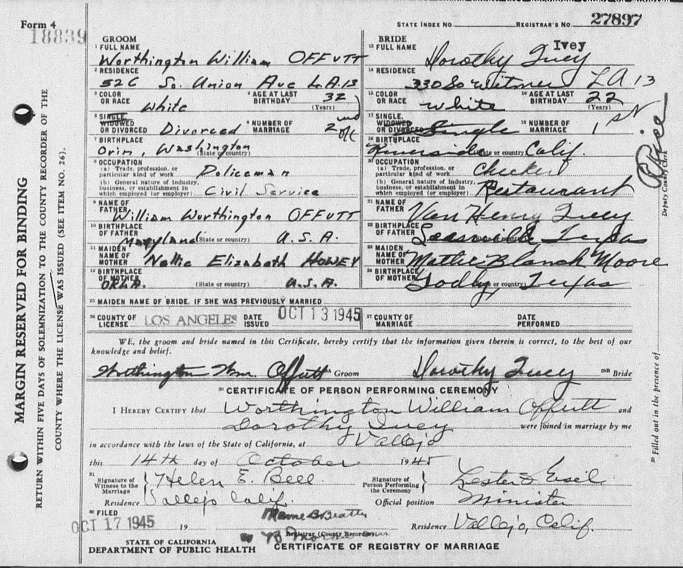 Marriage License and Certificate of Marriage for Worthington W. Offutt to Dorothy Ivey