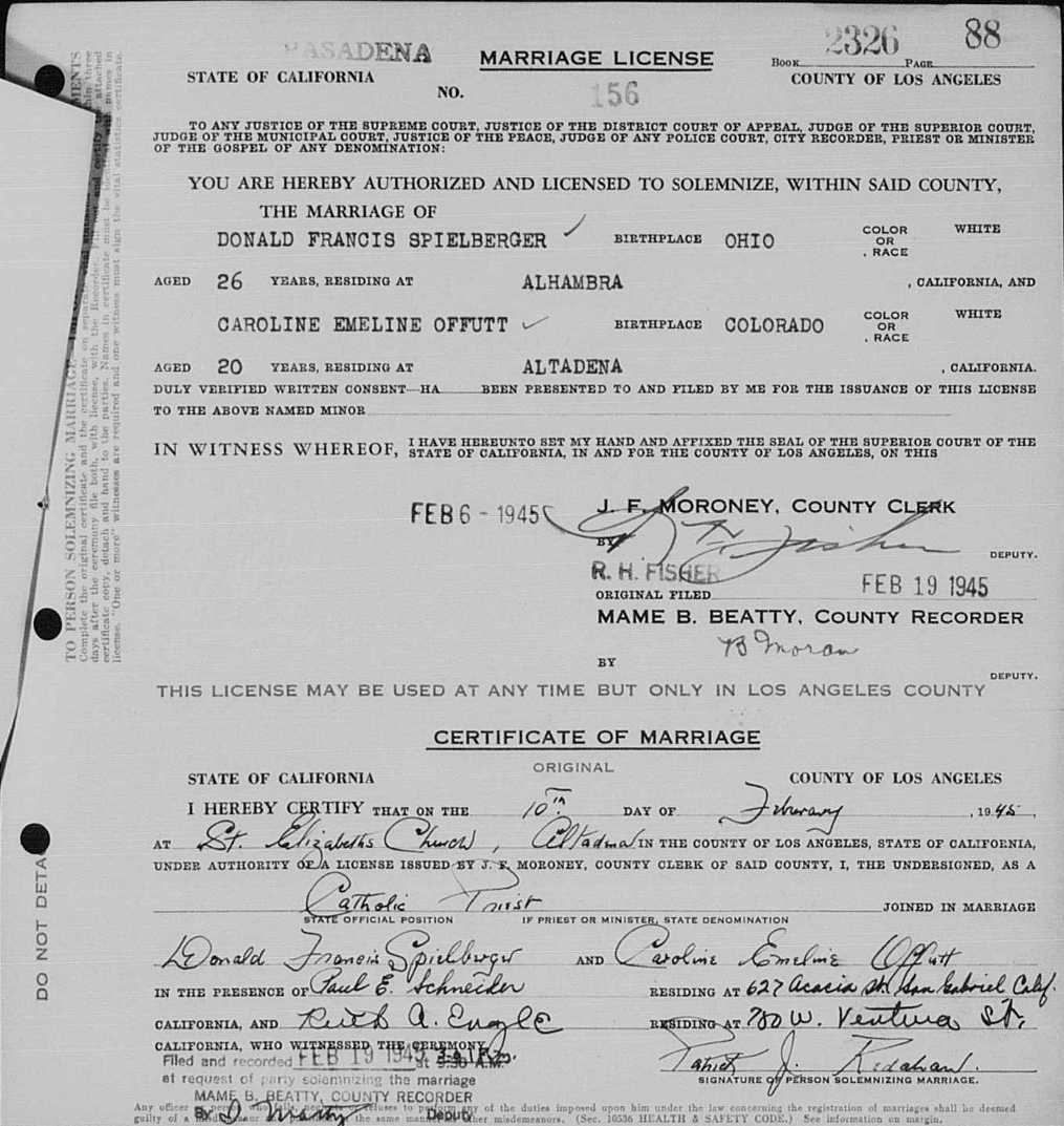 Marriage License Caroline Emeline Offutt to Donald Francis Spielberger