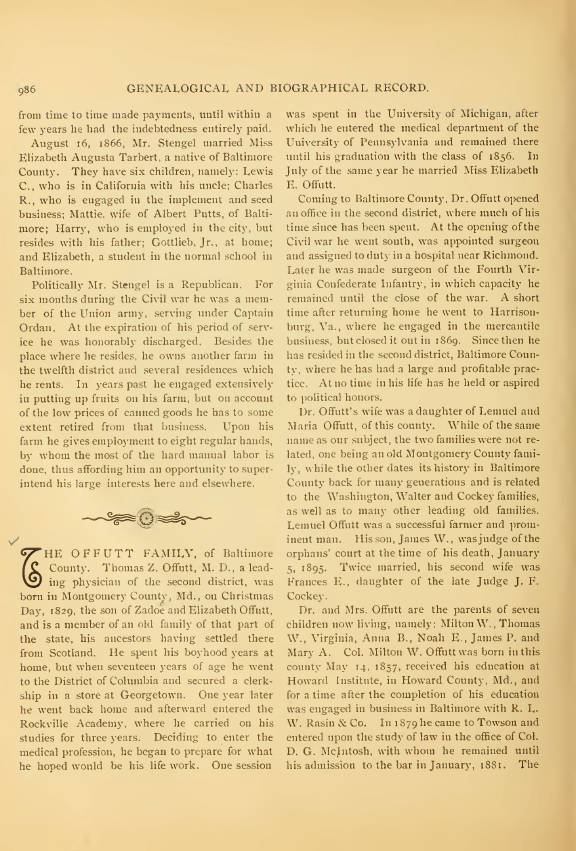 Page 986 from Genealogy and Biography of Leading Families of the City of Baltimore. Thomas Z. Offutt biography