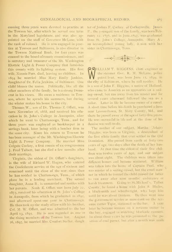 Page 987 from Genealogy and Biography of Leading Families of the City of Baltimore. Thomas Z. Offutt biography continued