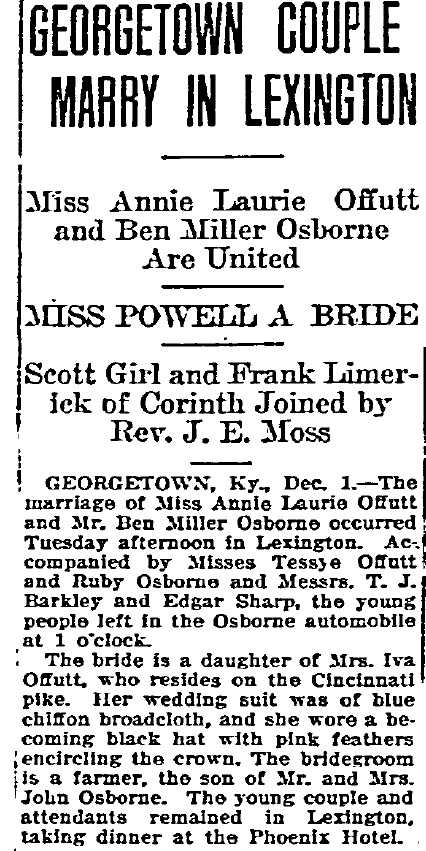 Wedding announcement for Annie L. Offutt and Ben M. Osborne