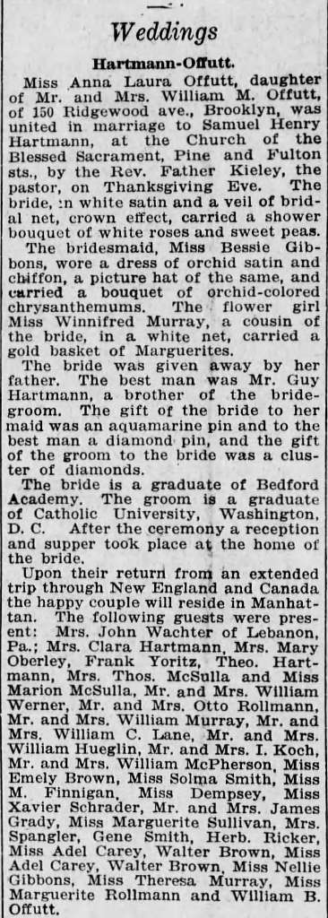 Wedding of Anna Laura Offutt to Samuel Henry Hartman(n)