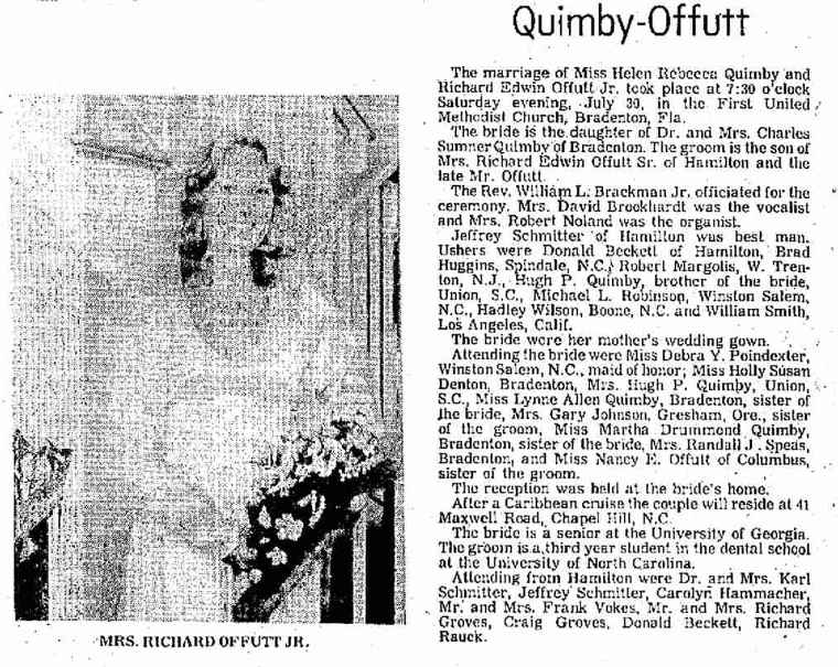 Wedding Announcement for Helen Rebecca Quimby and Richard Edwin Offutt Jr.
