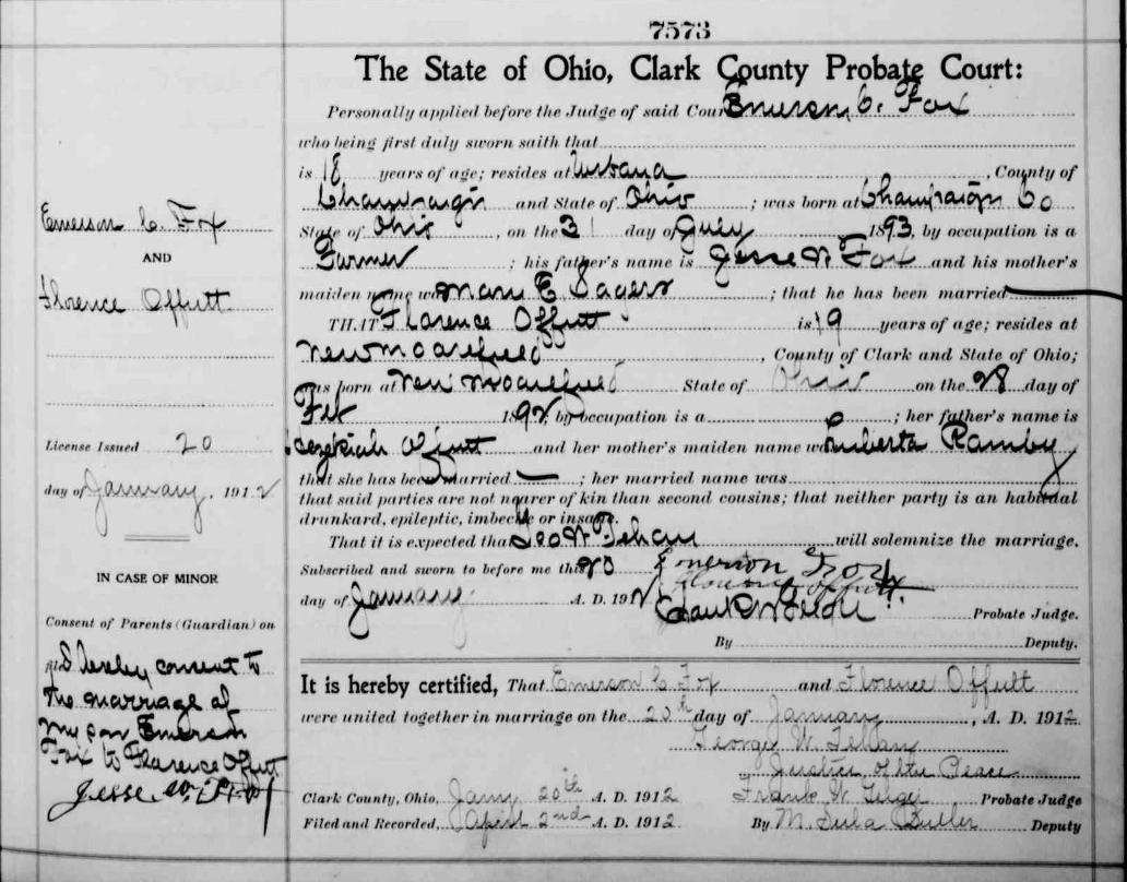Marriage License and Certificate of Marriage for Emerson C. Fox and Florence Offutt