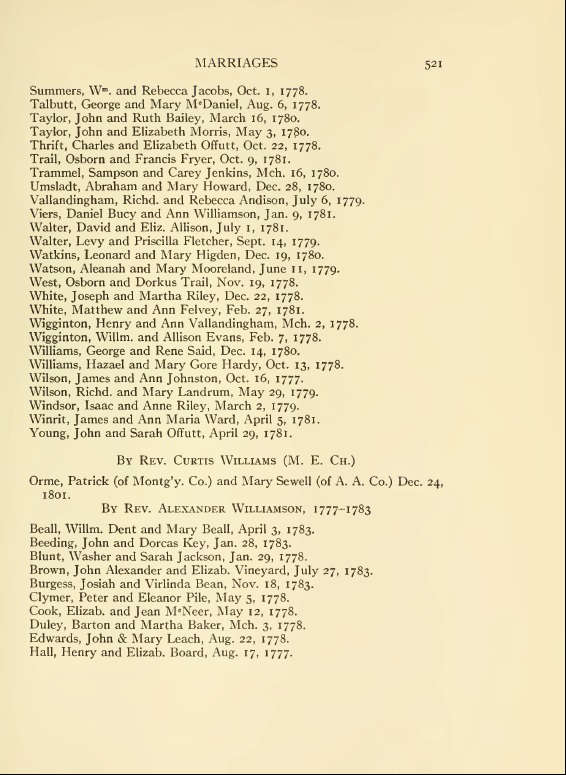 Page 521 of Maryland Records Colonial, Revolutionary, County and Church From Original Sources. Marriages performed in Montgomery County by the Reverend Joseph Threlkeld