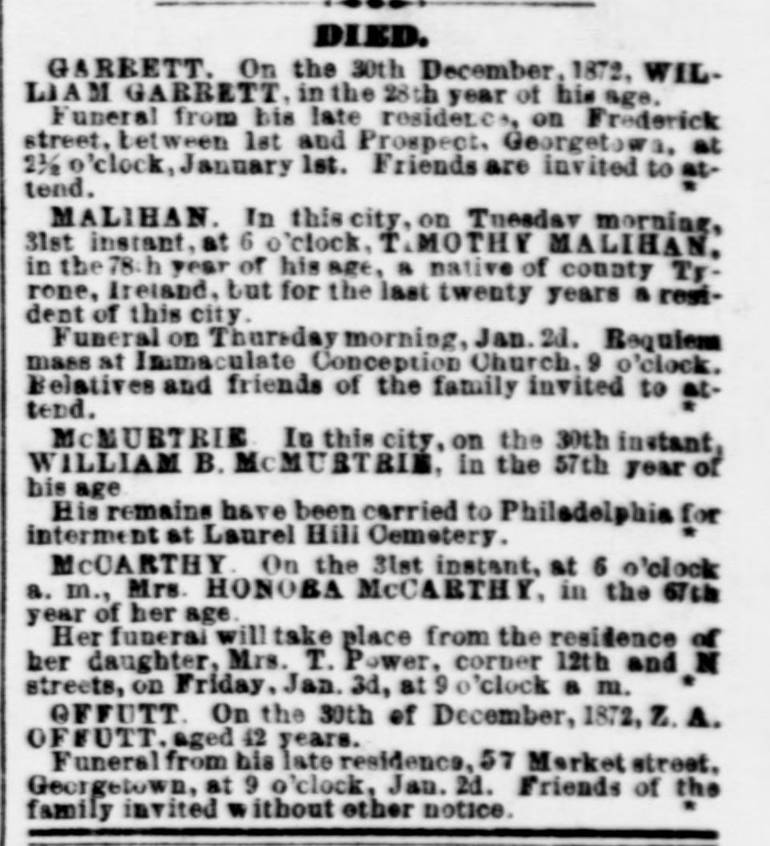 Printed in the December 31, 1872 issue of the Evening Star, on page 3