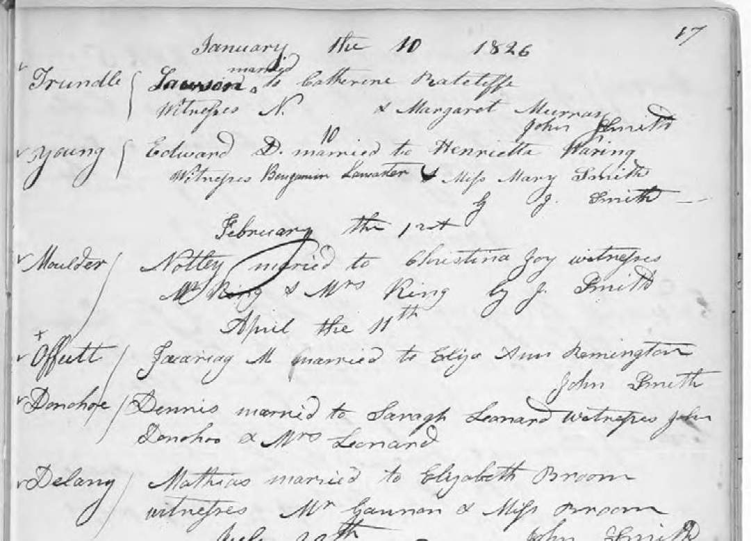 Holy Trinity Church Marriage Register entry for Zacharia or Zachariay Offutt and Eliza Ann Remington