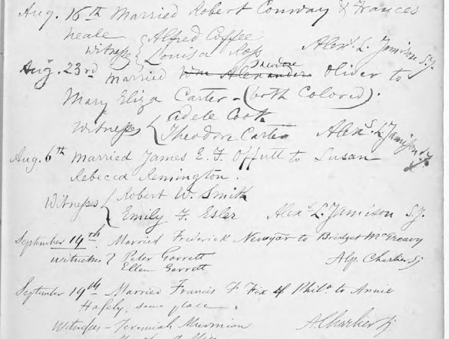 Holy Trinity Church Marriage Register page 167; entry for James E. F. Offutt and Susan Rebecca Remington