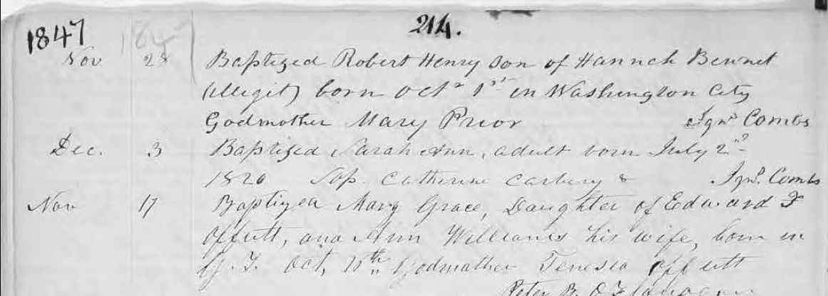 Holy Trinity Church Baptism Register Page 214, Mary Grace Offutt, November 17, 1847