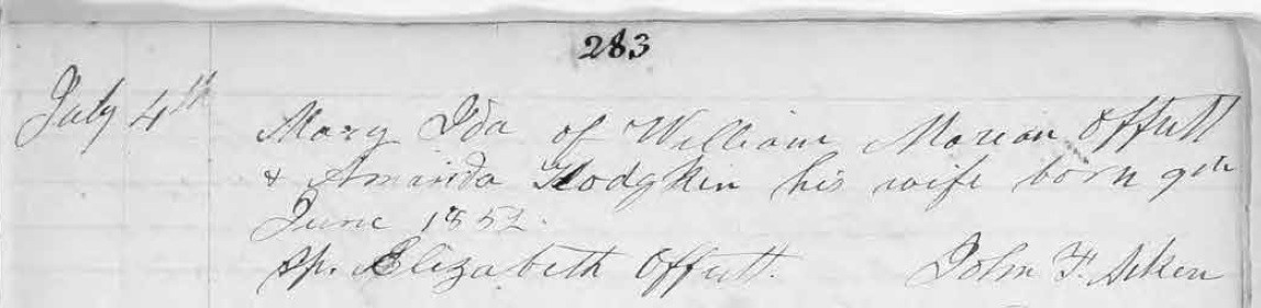Holy Trinity Church Baptism Register Page 283, Mary Ida Offutt, July 4, 1852