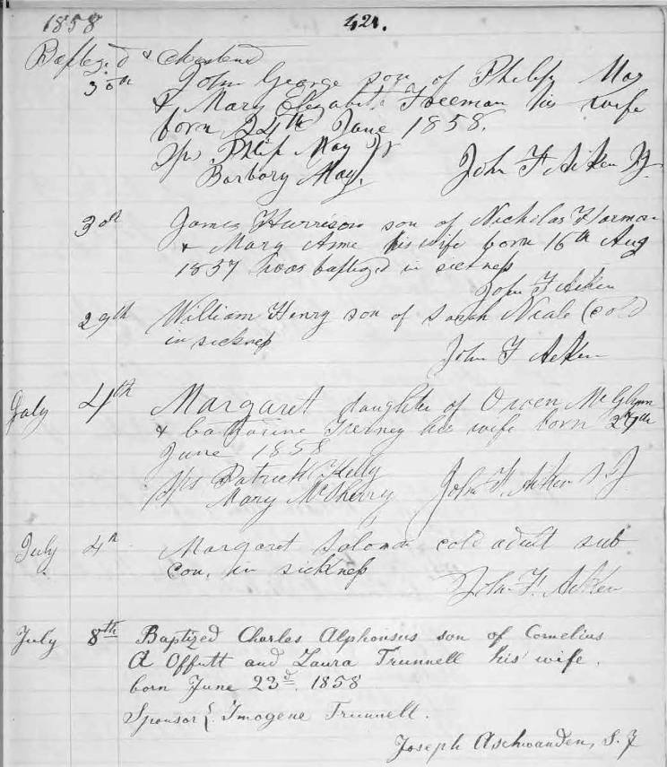 Holy Trinity Church Baptism Register Page 421, Charles Alphonses Offutt, July 8, 1858