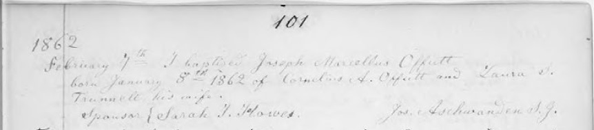 Holy Trinity Church Baptism Register Page 101, lists Joseph Marcellus Offutt baptized February 2, 1862
