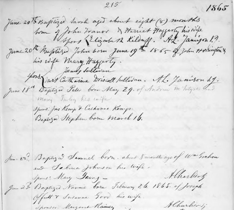 Holy Trinity Church Baptism Register Page 215, lists Nannie Offutt baptized June 23, 1865