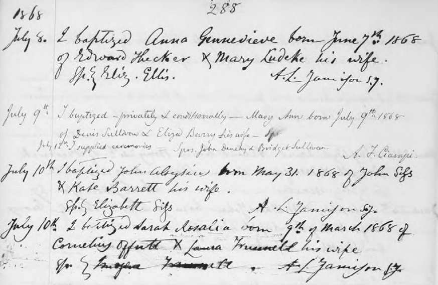 Holy Trinity Church Baptism Register Page 288, lists Sarah Rosalia Offutt baptized July 10, 1868