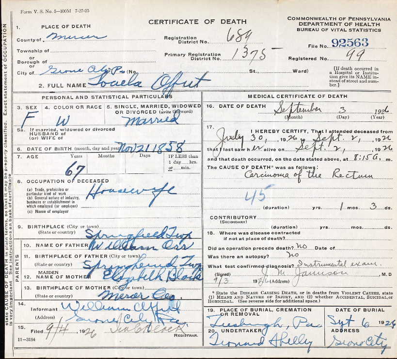 Pennsylvania Certificate of Death for Louela Offut (Note spelling)