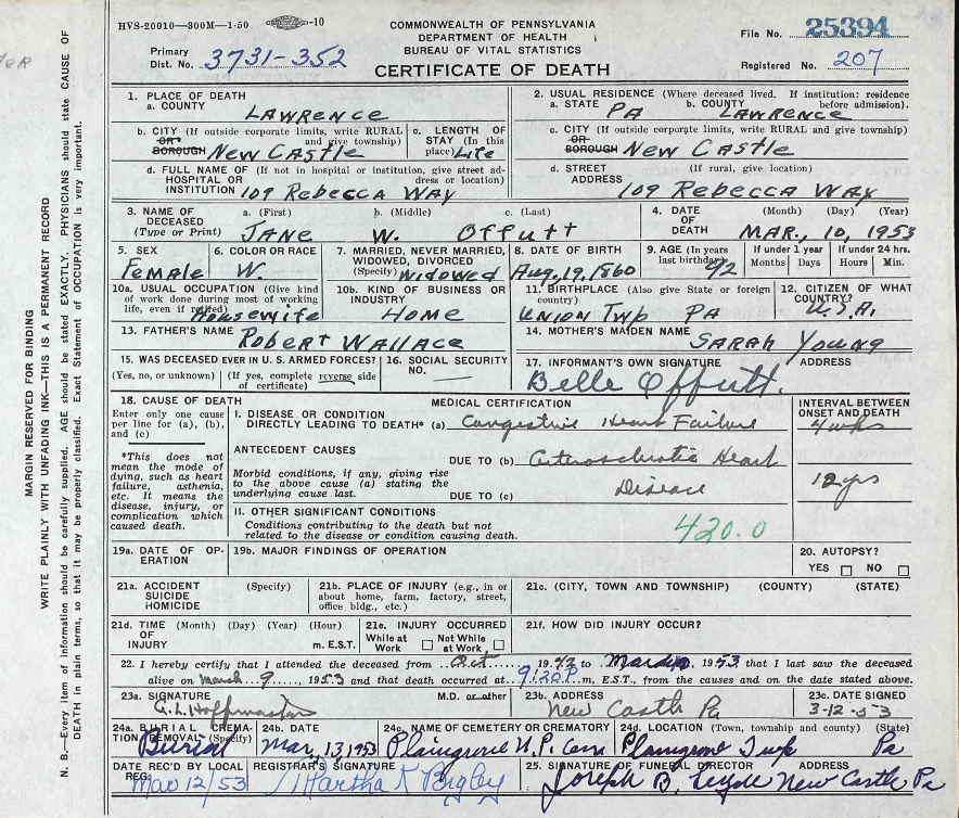 Pennsylvania Certificate of Death for Jane W. Offutt