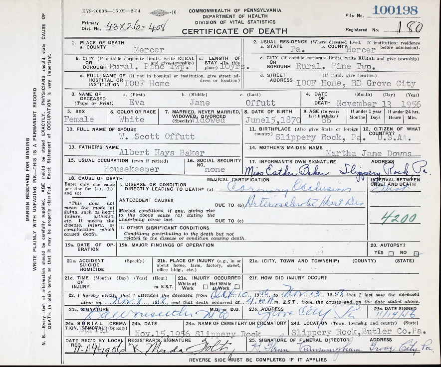 Pennsylvania Certificate of Death for Eva Jane Offutt