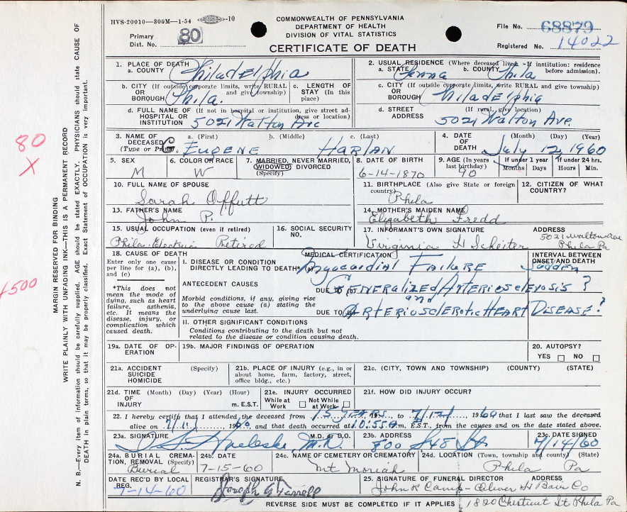 Pennsylvania Certificate of Death for G. Eugene Harlan