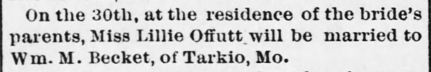 Wedding Announcement of Lillie Offutt to Wm. M. Becket