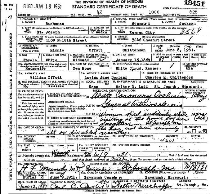 MO Death Certificate for Minnie Offutt Chittenden