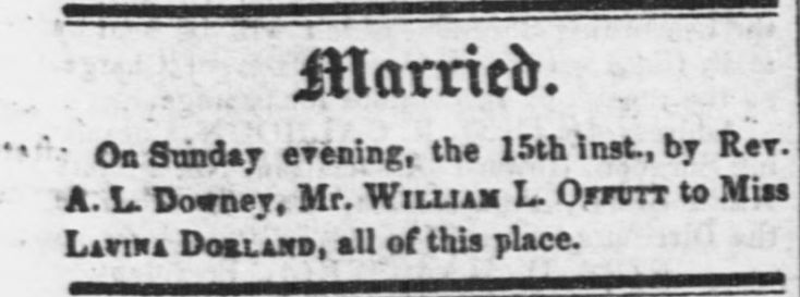 Marriage notice of William L. Offutt to Miss Lavina Dorland