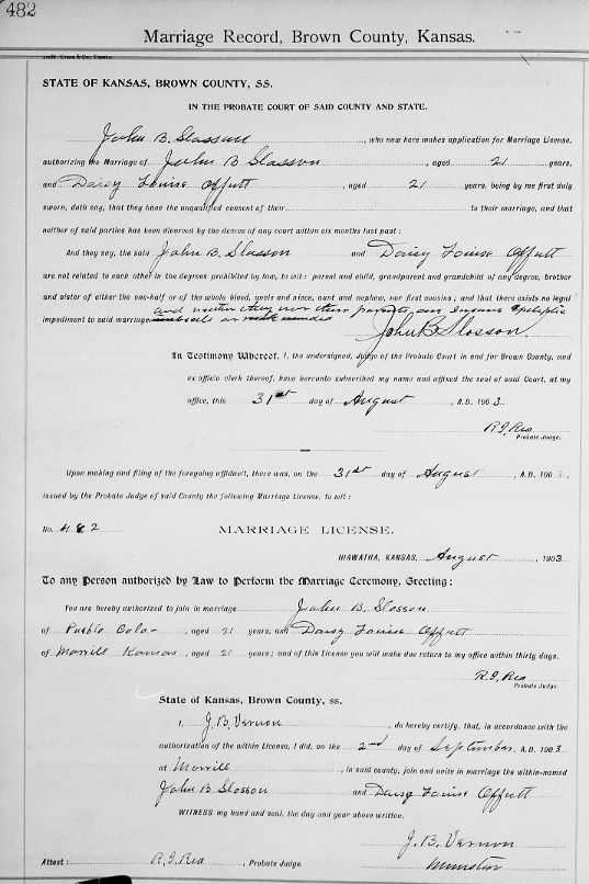 Brown County Kansas Marriage record for Daisy Louise Offutt and John B. Slosson