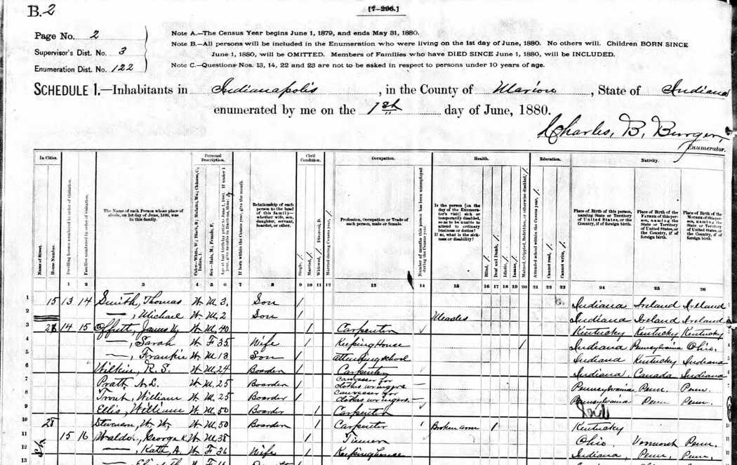 1880 Federal Census; Indianapolis, Marion County, IN. Household of James V. Offutt