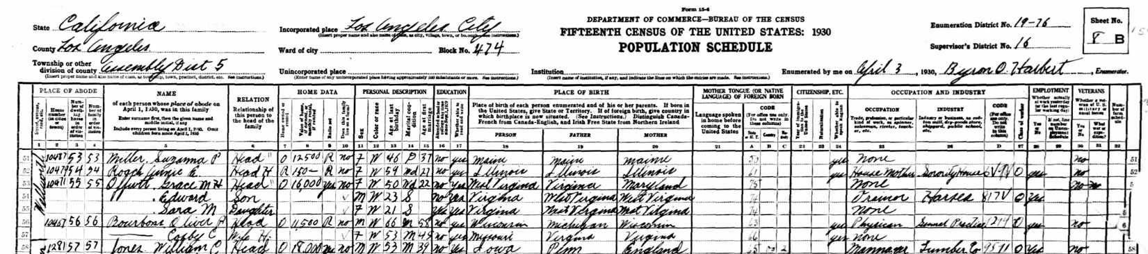 1930 Federal Census; Los Angeles, Los Angeles County, CA. Household of Grace M. H. Offutt