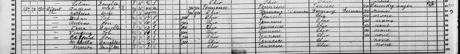 1920 Federal Census; Cincinnati, Hamilton County, OH. Household of Andrew Offutt (Indexed as Andrew Offert)