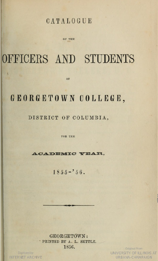 Catalogue of Officers and Students of Georgetown College, District of Columbia for the academic year 1855-1856, Title Page.