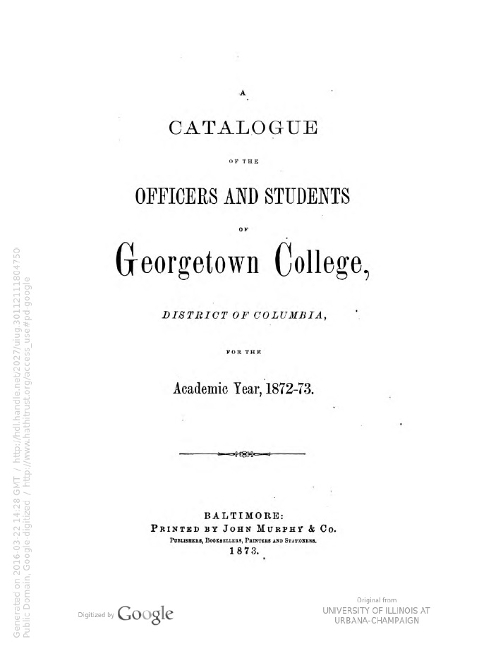 Catalogue of Officers and Students of Georgetown College, District of Columbia for the academic year 1872 - 1873, Title Page.
