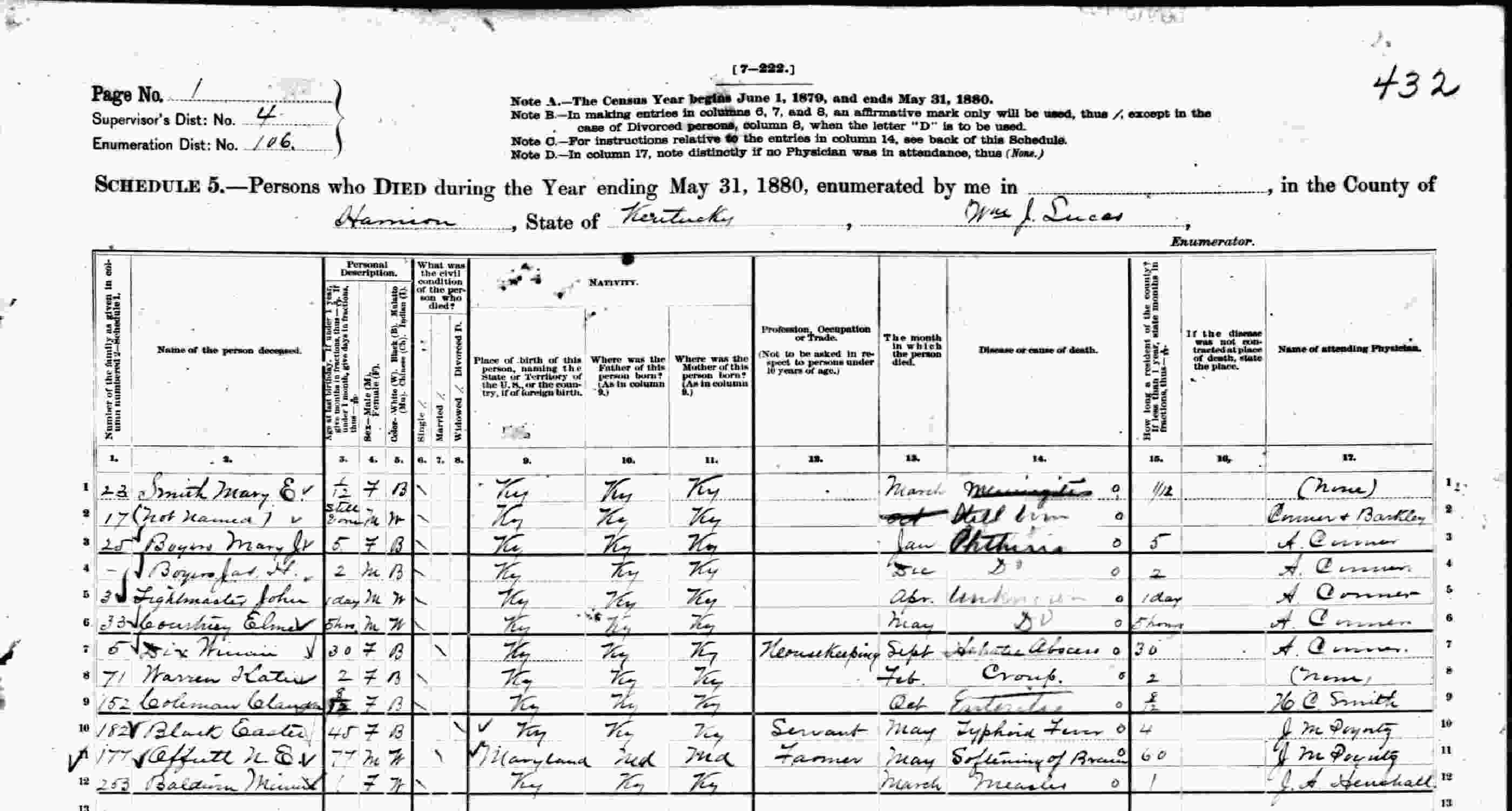 1880 Harrison County Kentucky Mortality Schedule, line 11 lists N. E. Offutt