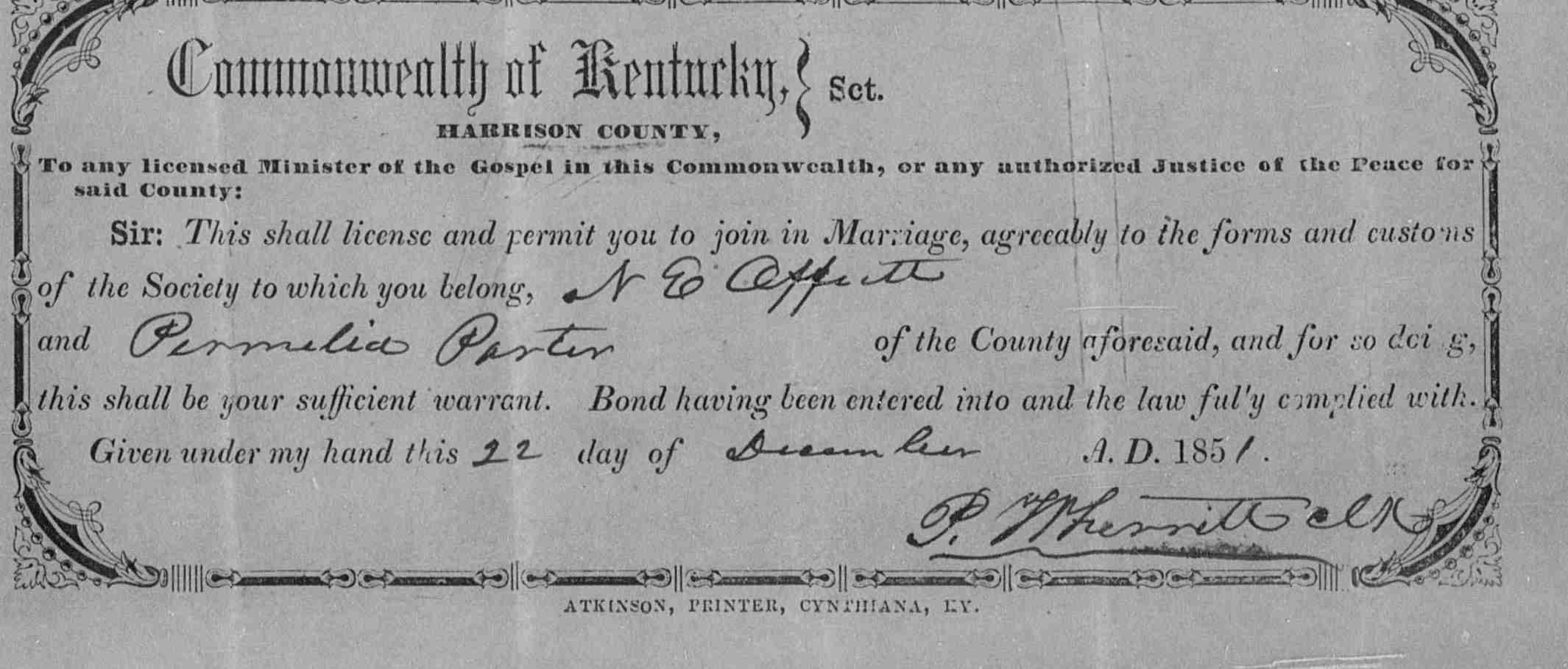 Harrison County Kentuck Marriage License for N. E. Offutt and Pamila Porter
