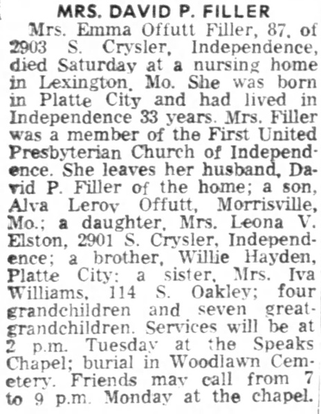 Death of Mrs. Emma Offutt Filler