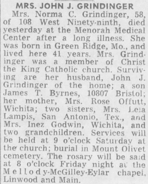 Death of Mrs. John J. Grindinger