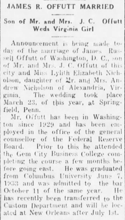 Wedding of James R. Offutt to Lylith E. Nicholson