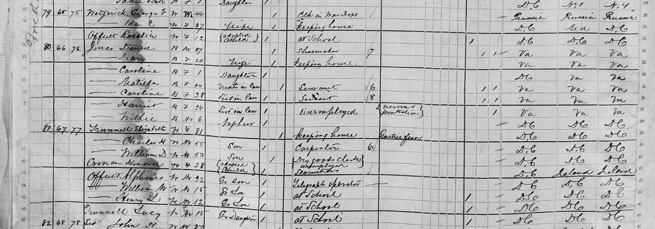 1880 Federal Census for Georgetown, DC listing the household of Elizabeth Trunnell