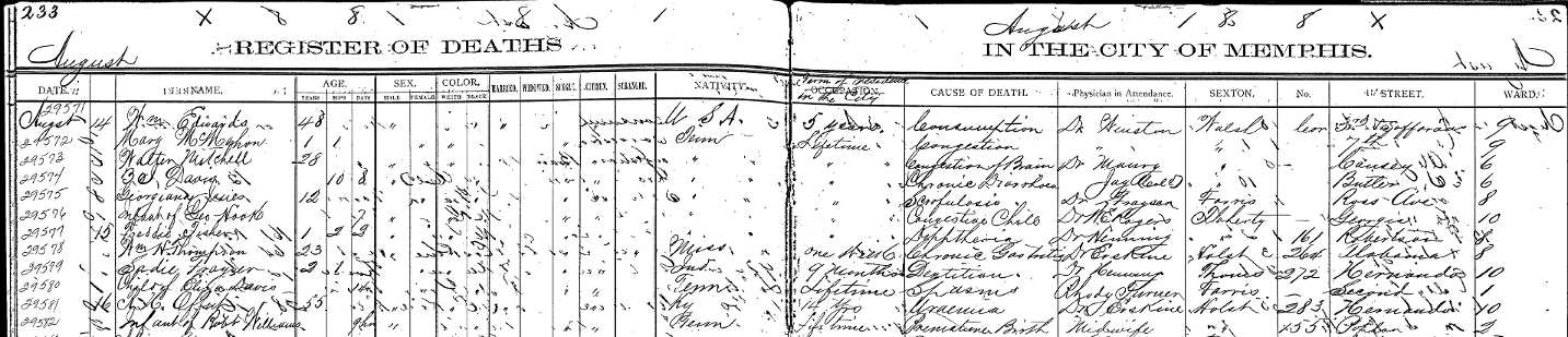 City of Memphis Death Register for 1881, page 233 #29851. Entry for R. H. Offutt