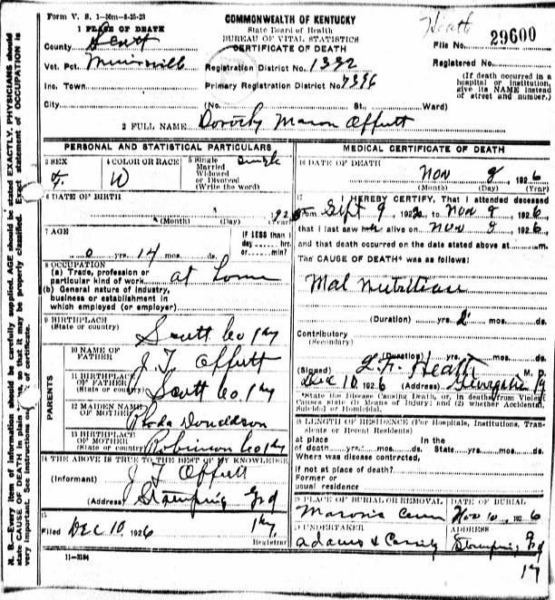 Kentucky Death Certificate for Dorothy Marion Offutt