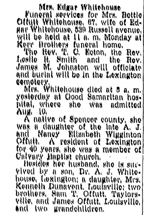 Funeral Notice for Mrs. Bettie (Offutt) Whitehouse