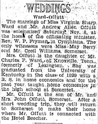 Wedding of Andrew Allen Offutt to Virginia Sharp Ward
