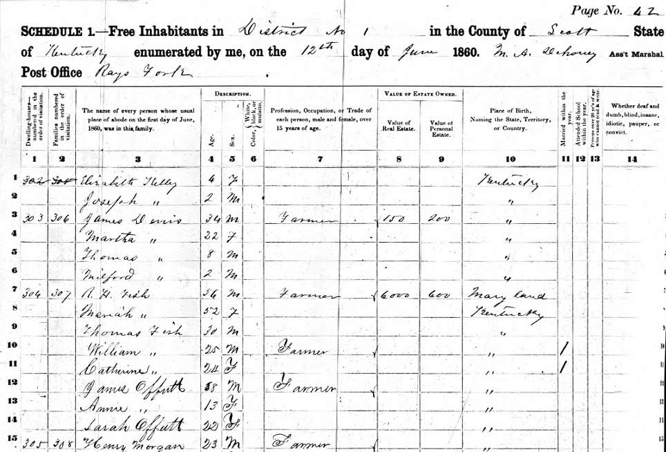 1860 Federal Census of District 1, Scott County, KY. Household of R. H. Fish, lists James, Annie and Sarah Offutt