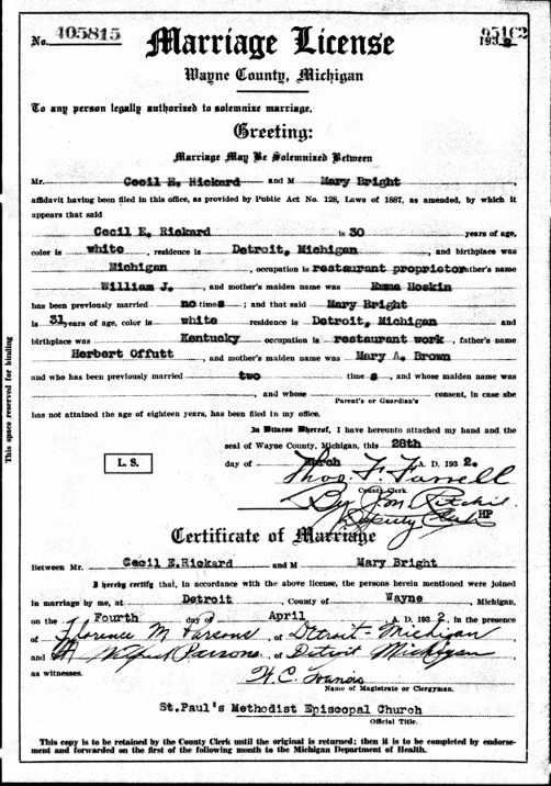 Wayne County Michigan Marriage Record for Mary (nee Offutt) Bright to Cecil E. Rickard