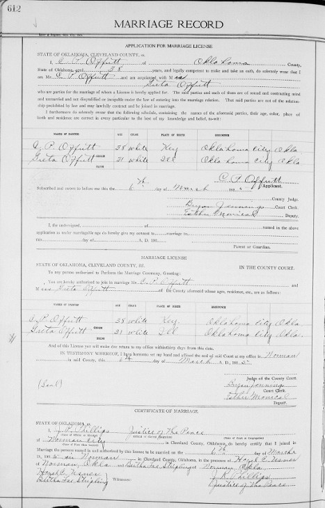 Marriage Record for C. P. Offutt and Greta Offutt